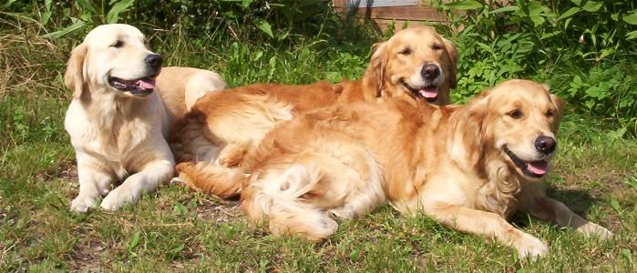 Nadat ze ook aan onze hoge werkeisen voldeed hebben we een eerste nestje met haar gefokt, geboren 18 februari 2010 (zie pagina Nestje 2010). En een tweede nestje dat is geboren op 28 juni 2012 (zie pagina Nest Justine 2012). Ons gaat het immers allereerst erom om te zorgen dat onze Goldens klaar zijn hiervoor. Met alle kwalificaties die volgens onze eigen eisen daarbij behoren. Dat wil dus zeggen: gezondheid, karakter, werk- en showresultaten. Onderstaand ziet u haar links op een groepsportret met halfzus Duchesse (rechts) en trotse moeder Chérie (midden). (foto: oktober 2007).